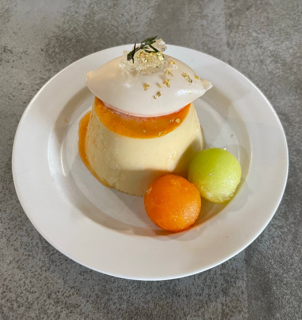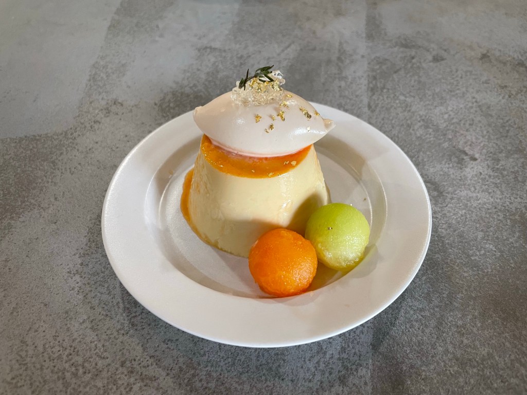 カラメルの代わりにメロンのソースが使用されており、プリンの上にはメロンクリームと白ワインジュレが乗っています。横にはくり抜いたメロンも添えられてメロン尽くしという感じです。